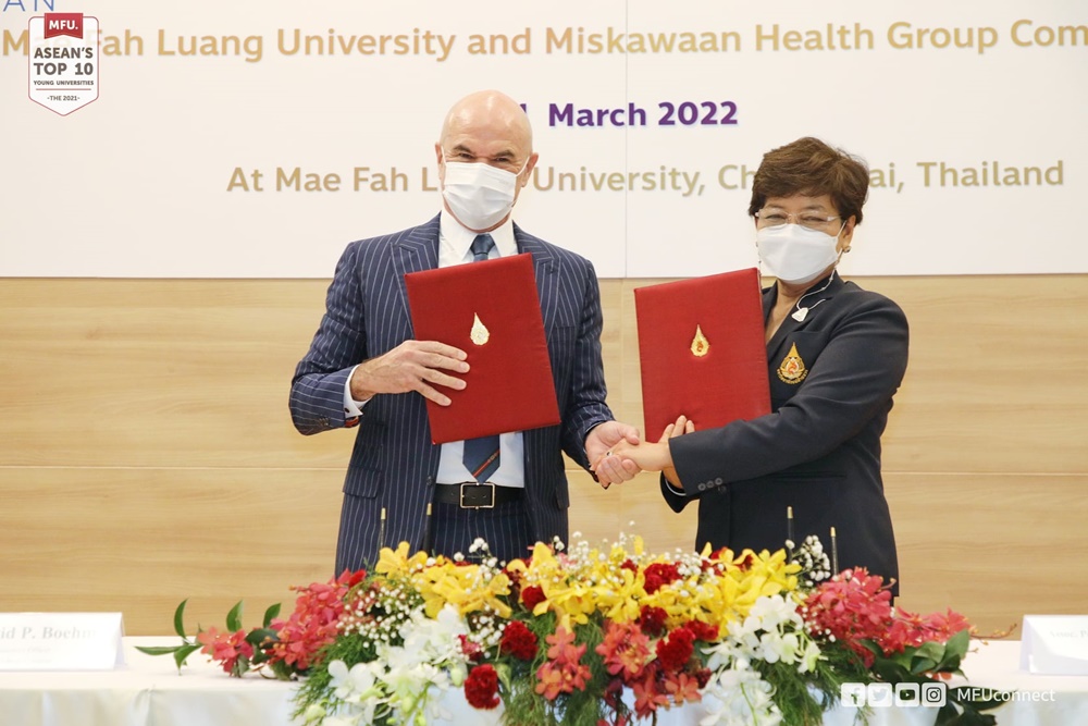 มหาวิทยาลัยแม่ฟ้าหลวง (Mae Fah Luang University) นำโดย รองศาสตราจารย์ ดร.ชยาพร วัฒนศิริ อธิการบดีมหาวิทยาลัย ได้จัดทำบันทึกข้อตกลงความร่วมมือ (MOU) กับบริษัท มิสกวาน เฮลธ์ กรุ๊ป จำกัด (Miskawaan Health Group Company Limited หรือ MHG ) นำโดย มร. เดวิด บอม ประธานเจ้าหน้าที่บริหาร เพื่อสร้างความร่วมมือทางวิชาการ การวิจัย และการพัฒนาผลิตภัณฑ์สู่เชิงพาณิชย์ โดยมี ศูนย์นวัตกรรมสมุนไพรครบวงจร มหาวิทยาลัยแม่ฟ้าหลวง เป็นหน่วยงานหลักในการดำเนินการ ร่วมกับ สำนักวิชาการแพทย์บูรณาการ สำนักวิชาแพทย์ศาสตร์ สำนักวิชาวิทยาศาสตร์ สำนักวิชาอุตสาหกรรมเกษตร และสำนักวิชาวิทยาศาสตร์เครื่องสำอาง โดยมุ่งเน้นการวิจัยและพัฒนาสารสกัดจากธรรมชาติ ตั้งแต่ระดับห้องปฏิบัติการ (In vitro) ระดับสัตว์ทดลอง (In vivo) และการวิจัยทางคลินิก (Clinical trial) เพื่อการพัฒนาเป็นยาและผลิตภัณฑ์สุขภาพ เมื่อวันที่ 1 มีนาคม 2565 ที่ห้องคำมอกหลวง มหาวิทยาลัยแม่ฟ้าหลวง จังหวัดเชียงราย