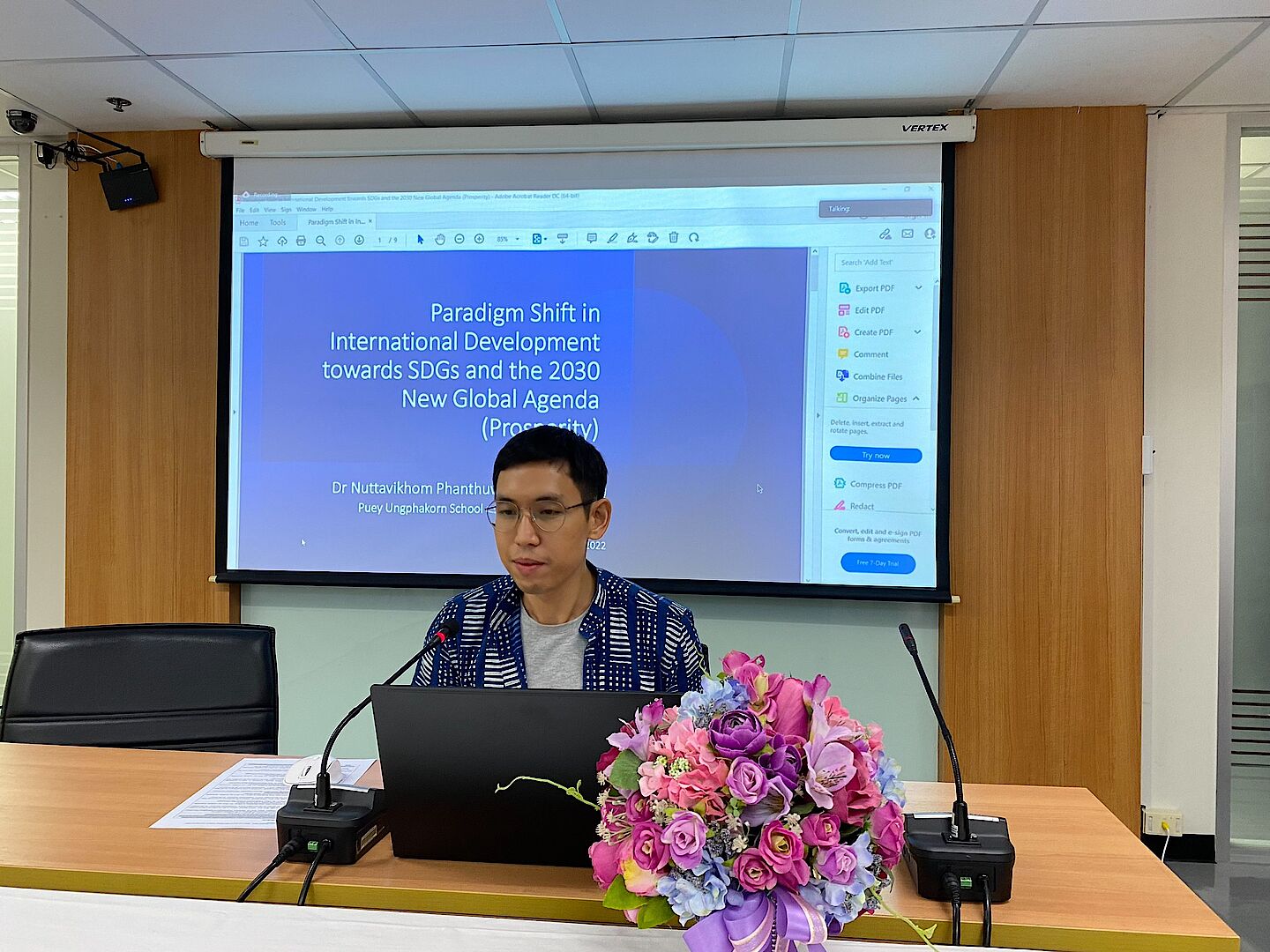 สำนักวิชานวัตกรรมสังคม (สำนักงานกรุงเทพฯ) อาคารปัญจภูมิ กรุงเทพฯ ได้จัดงานเสวนาวิชาการในด้านการพัฒนาระหว่างประเทศ ในหัวข้อ A Hybrid Panel "Paradigm Shift in International Development towards SDGs and the 2030 New Global Agenda (5Ps - People, Planet, Prosperity, Partnership, Peace)” ร่วมกับ Heinrich Böll Stiftung (สำนักงานเอเชียตะวันออกเฉียงใต้) สหพันธ์รัฐเยอรมนี เมื่อวันศุกร์ที่ 17 มิถุนายน พ.ศ. 2565 โดยมีนักวิชาการด้านรัฐศาสตร์ ความสัมพันธ์ระหว่างประเทศ ภูมิศาสาตร์ สิ่งแวดล้อม เศรษฐศาสตร์และสันติภาพ จากจุฬาลงกรณ์มหาวิทยาลัย มหาวิทยาลัยธรรมศาสตร์ มหาวิทยาลัยเชียงใหม่ Gadjah Mada Univeristy ประเทศอินโดนีเซีย และ Asian Univeristy for Women ประเทศบังคลาเทศ เข้าร่วมการเสวนา ทั้งนี้ อาจารย์ ดร.ฉลองรัฐ เจริญศรี ผู้ช่วยคณบดีสำนักวิชานวัตกรรมสังคม ได้กล่าวเปิดการเสวนา โดยมีอาจารย์ ดร.จารุวรรณ หัตถผสุ เป็นผู้ดำเนินรายการ