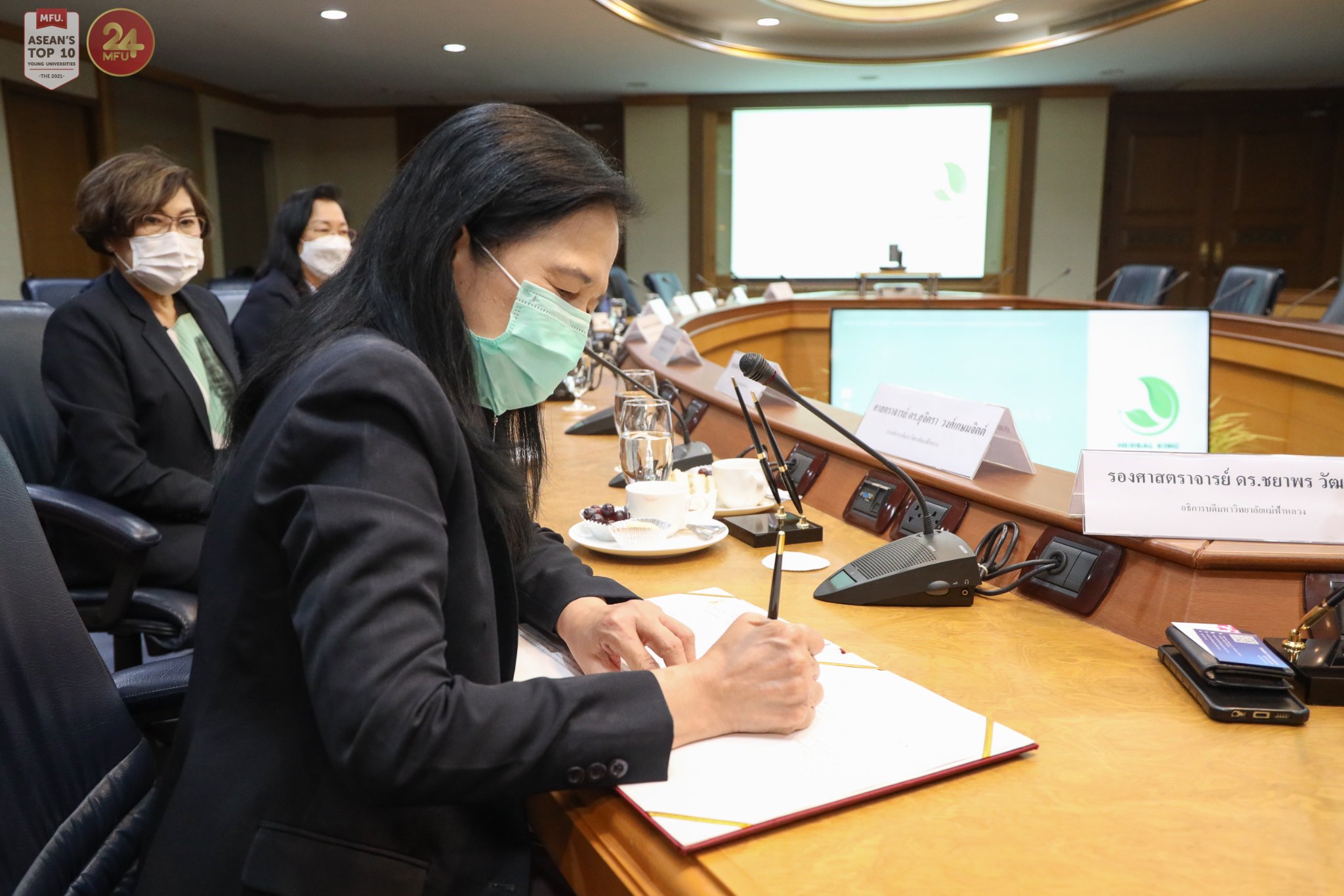 “นอกจากนี้ยังมีความร่วมมือของสถาบันวิจัยและนวัตกรรม ส่วนจัดการทรัพย์สินทางปัญญาและนวัตกรรม เพราะการทำงานที่จะเกิดขึ้น มีกลไกที่เกี่ยวกันพันในการสร้างงานวิจัยและนวัตกรรม รวมถึงกลไกในการนำมาใช้ประโยชน์ร่วมกันอย่างชัดเจน โดยเฉพาะการนำไปใช้ประโยชน์ในเชิงพาณิชย์ ก็เป็นอีกเป้าหมายหนึ่งของมหาวิทยาลัย การที่จะนำเหล่าอาจารย์ไปทำงานด้านธุรกิจอาจไม่ได้มีความเชี่ยวชาญมากนัก เพราะอาจารย์ถนัดที่จะสอน ถนัดสร้างองค์ความรู้ ถนัดทำวิจัย มหาวิทยาลัยอาจเป็นตัวกลางน้ำที่จะผลิตงานวิจัย ทำผลิตภัณฑ์ออก เราจึงจับมือกับคนที่นำไปสู่ปลายน้ำในเชิงพาณิชย์ เพื่อหาพาร์ทเนอร์มาเสริมในจุดที่เราอยากเข้มแข็ง เพื่อไปถึงเป้าหมายที่วางไว้ร่วมกัน” อธิการบดี มฟล. กล่าว