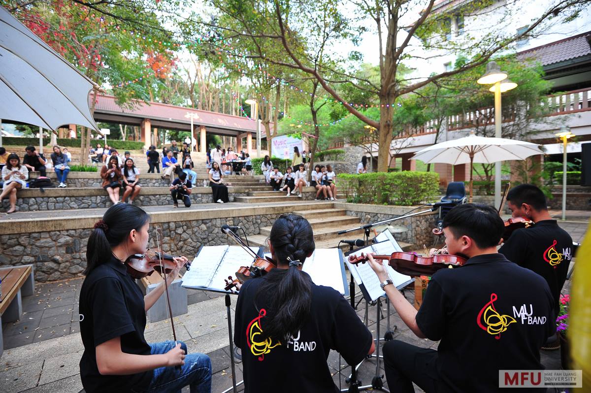 สำนักงานให้คำปรึกษาและช่วยเหลือนักศึกษา มหาวิทยาลัยแม่ฟ้าหลวง (มฟล.) จัด กิจรรมฟังดนตรีเพื่อการผ่อนคลาย : ดนตรีสร้างสุข เมื่อวันพฤหัสบดีที่ 22 กุมภาพันธ์ 2561 ณ ลานกิจกรรม ศูนย์บรรณสารและสื่อการศึกษา เนื่องด้วยทางสำนักงานได้เก็บข้อมูลเกี่ยวกับการให้บริการให้คำปรึกษาแก่นักศึกษา มักจะพบว่ามีความเครียดและวิตกกังวลในช่วงของการสอบ ดังนั้นจึงได้มีแนวคิดในการจัดกิจกรรมเพื่อการผ่อนคลายความตึงเครียดให้แก่นักศึกษา นอกจากกิจกรรมดนตรีสร้างสุขที่มีวงดนตรีมหาวิทยาลัย MFU Band มาบรรเลงบทเพลงเพราะๆ เพื่อช่วยให้นักศึกษาที่เข้าร่วมกิจกรรมมีความผ่อนคลายสบายอารมณ์แล้ว ทางสำนักงานยังได้สอดแทรกความรู้ในการจัดการความเครียดด้วยตนเอง โดยได้รับเกียรติจาก อาจารย์กานต์จนาภา สถิรชวา จากสำนักวิชาวิทยาศาสตร์เครื่องสำอาง ได้มาให้ความรู้แก่ผู้เข้าร่วมกิจกรรมในการใช้ดนตรีปรนนิบัติอารมณ์ให้เป็นไปในแนวทางที่ตนเองต้องการ เพราะไม่ใช่เพียงแต่ร่างกายเท่านั้นที่ต้องการปรนนิบัติ แต่จิตใจก็ต้องการการดูแลไปควบคู่กัน ดังนั้นการเลือกฟังเพลงก็เป็นอีกวิธีการที่ช่วยให้เกิดความผ่อนคลาย ลดความเครียดได้