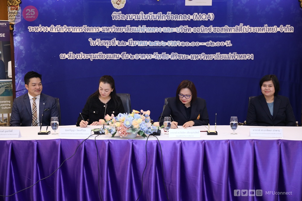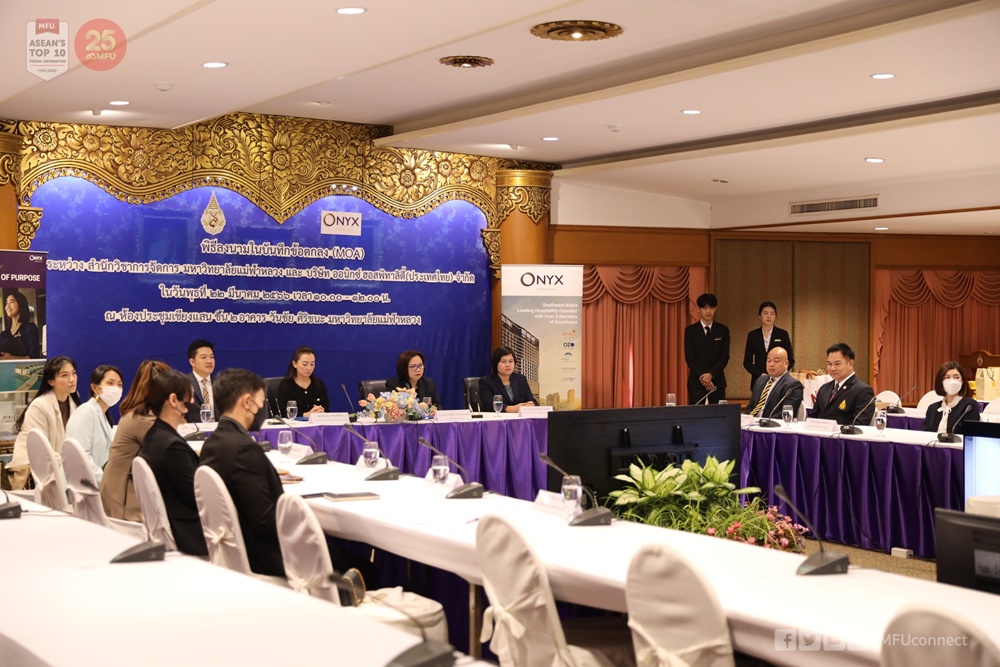 ดร.ปิยธิดา เพียรลุประสิทธิ์ คณบดีสำนักวิชาการจัดการ มหาวิทยาลัยแม่ฟ้าหลวง (มฟล.) และ คุณสรัญญา วัฒนศิริสุข รองประธานกรรมการอาวุโสฝ่ายทรัพยากรบุคคล บริษัท ออนิกซ์ ฮอสพิทาลิตี้ (ประเทศไทย) จำกัด ซึ่งดำเนินธุรกิจด้านโรงแรม เซอร์วิส อพาร์ตเมนต์ และสปาชั้นนำในภูมิภาคเอเชียตะวันออกเฉียงใต้ ที่แตกต่างและโดดเด่นทางด้านการบริการ มีสถานประกอบการในเครือ อมารี โอโซ่ ชามา และ บรีซสปา ครอบคลุมทั้งในประเทศไทยและต่างประเทศ ปัจจุบันมีโรงแรมที่เปิดให้บริการกว่า 50 แห่ง ใน 8 ประเทศ ได้ร่วมลงนามในบันทึกข้อตกลง MOA เพื่อสนับสนุนการเรียนการสอน เพื่อแลกเปลี่ยนข้อมูลความรู้ระหว่างกัน และทำการสนับสนุนให้เกิดการฝึกงานค้านธุรกิจการโรงแรม การบริการ ณ สถานประกอบการโรงแรมในเครือบริษัทในแบบการฝึกงานแบบปกติและในโครงการฝึกงานแบบเอกสิทธ์พิเศษ เมื่อวันพุธที่ 22 มีนาคม 2566 เวลา 10.00 – 12.00 น. ที่ห้องประชุมเชียงแสน อาคารวันชัย ศิริชนะ มหาวิทยาลัยแม่ฟ้าหลวง จ.เชียงราย ท่ามกลางคณะผู้บริหารจากทั้งสองฝ่าย