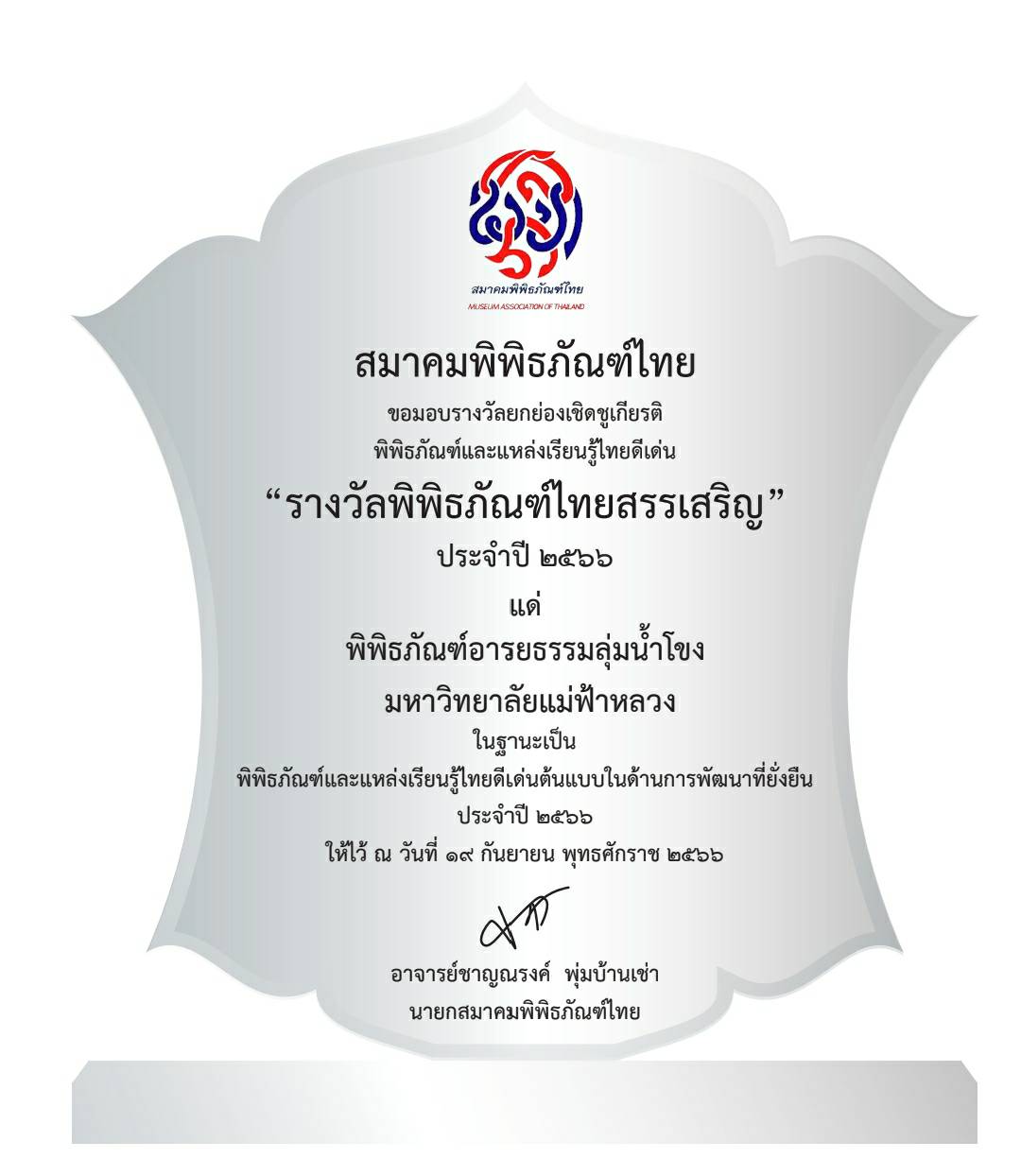 พิพิธภัณฑ์อารยธรรมลุ่มน้ำโขง มฟล. เข้ารับรางวัลยกย่องเชิดชูเกียรติพิพิธภัณฑ์และแหล่งเรียนรู้ดีเด่น ประจำปี 2566 ประเภทรางวัล พิพิธภัณฑ์ไทยสรรเสริญ