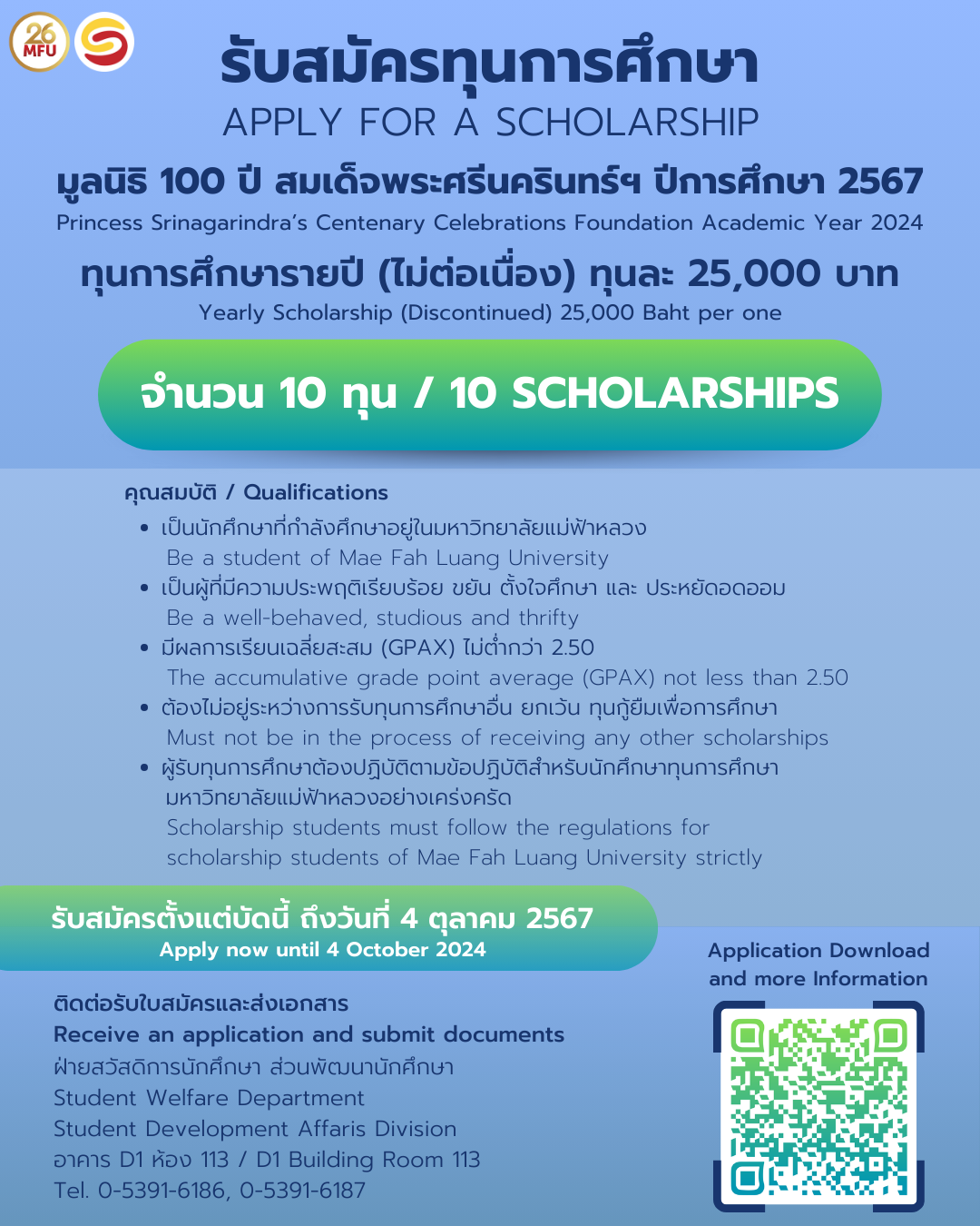5. Scholarship students must follow the regulations for scholarship students of Mae Fah Luang University