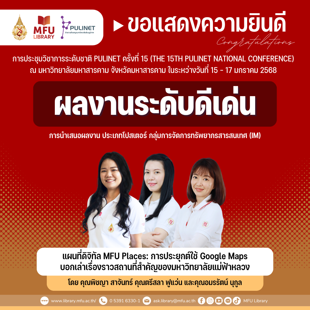 มหาวิทยาลัยแม่ฟ้าหลวงขอแสดงความยินดีกับบุคลากรศูนย์บรรณสารและสื่อการศึกษา มหาวิทยาลัยแม่ฟ้าหลวง คว้า 2 รางวัลใหญ่ ในงานประชุมวิชาการระดับชาติ PULINET ครั้งที่ 15