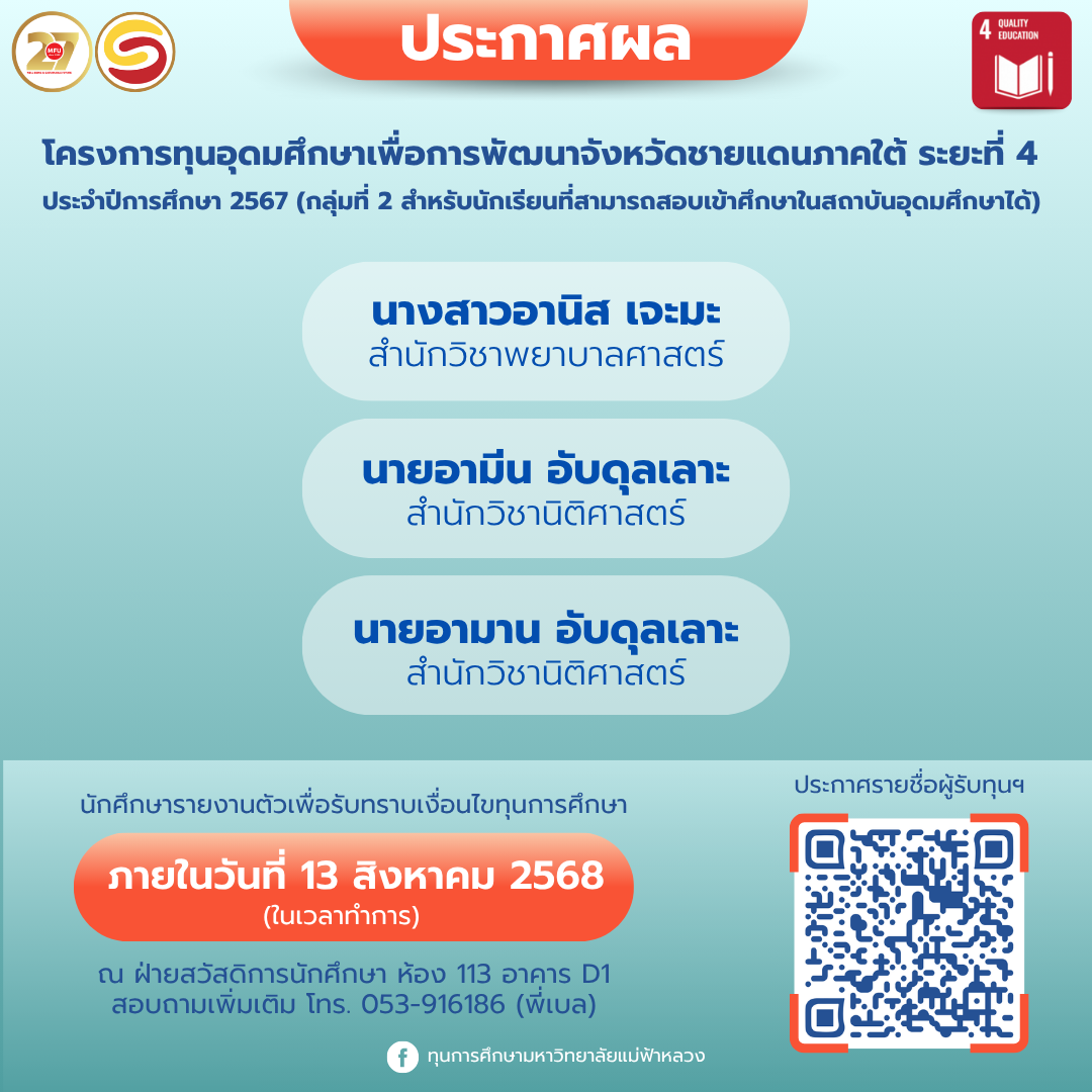 ขอให้นักศึกษารายงานตัวเพื่อรับทราบเงื่อนไขทุนการศึกษา ภายในวันที่ 13 สิงหาคม 2568 (ในเวลาทำการ)