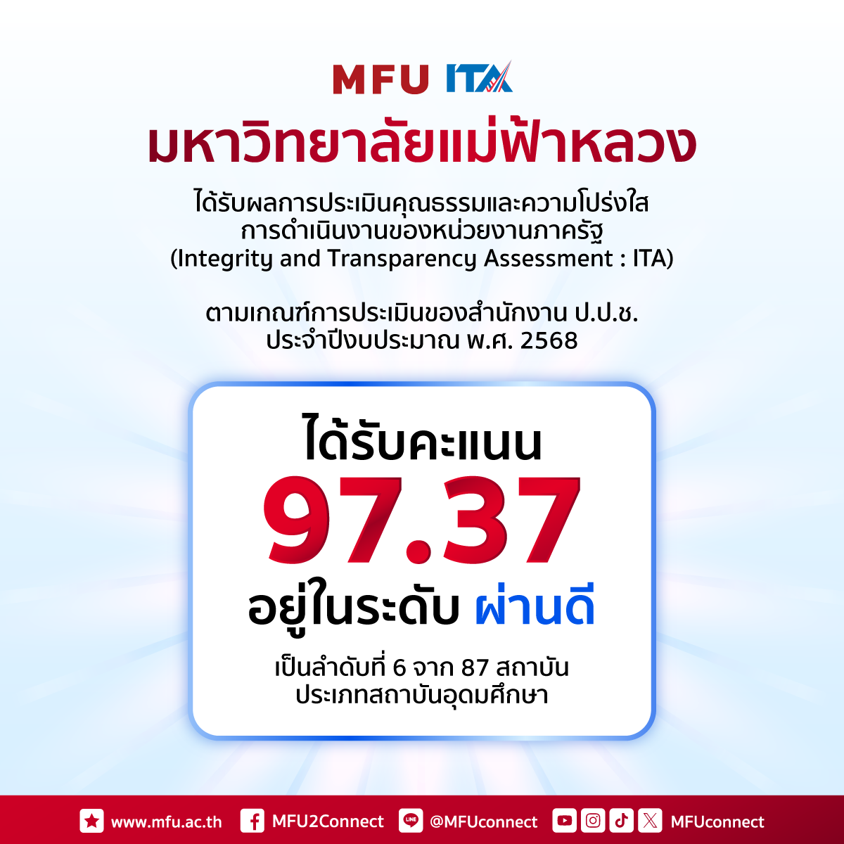 มฟล. ได้รับผลการประเมิน ITA ประจำปี 2568 ระดับ "ผ่านดี" ด้วยคะแนน 97.37 คะแนน เป็นลำดับที่ 6 จาก 87 สถาบันประเภทสถาบันอุดมศึกษา