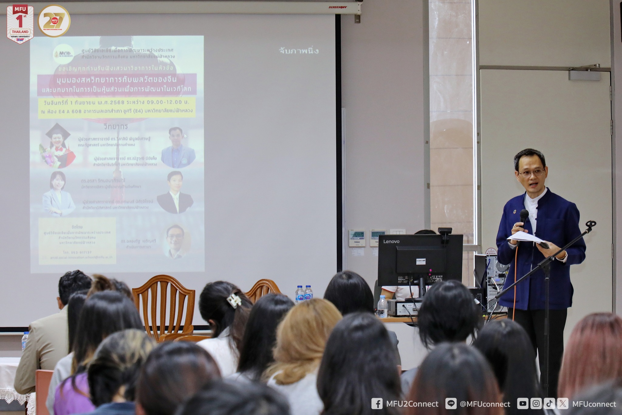 เมื่อวันที่ 1 กันยายน 2568 ศูนย์วิจัยเอเชียเพื่อการพัฒนาระหว่างประเทศ สำนักวิชานวัตกรรมสังคม มหาวิทยาลัยแม่ฟ้าหลวง (มฟล.) จัดกิจกรรมเสวนาวิชาการเรื่อง “มุมมองสหวิทยาการกับพลวัตรของจีนและบทบาทในการเป็นหุ้นส่วนเพื่อการพัฒนาในเวทีโลก” ณ ห้อง E4 608 อาคารพลเอกสำเภา ชูศรี (E4) โดยมีคณาจารย์ นักศึกษา และผู้สนใจเข้าร่วม กิจกรรมครั้งนี้จัดขึ้นเพื่อเฉลิมฉลองในโอกาสครบรอบ 50 ปี การสถาปนาความสัมพันธ์ทางการทูตระหว่างไทยและจีน