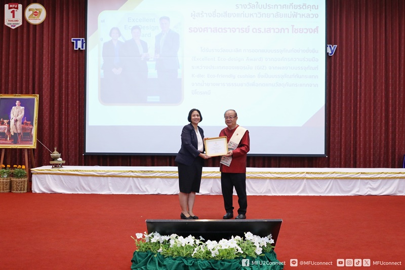 รองศาสตราจารย์ ดร.เสาวภา ไชยวงศ์ สำนักวิชาอุตสาหกรรมเกษตร ได้รับรางวัลยอดเยี่ยม การออกแบบบรรจุภัณฑ์อย่างยั่งยืน (Excellent Eco-design Award) จากองค์กรความร่วมมือระหว่างประเทศของเยอรมัน (GIZ) จากผลงานบรรจุภัณฑ์ K-dle: Eco-friendly cushion