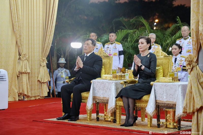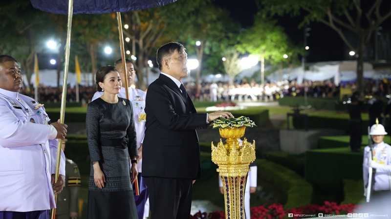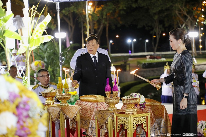 Their Majesties subsequently paid royal homage at the monument and participated in merit-making rites with members of the Sangha. On this occasion, Distinguished Professor Dr. Vanchai Sirichana presented monetary offerings for royal merit-making, while Assistant Professor Dr. Matchima Naradisorn introduced 18 benefactors of Mae Fah Luang University to receive commemorative tokens graciously bestowed by His Majesty in royal recognition.