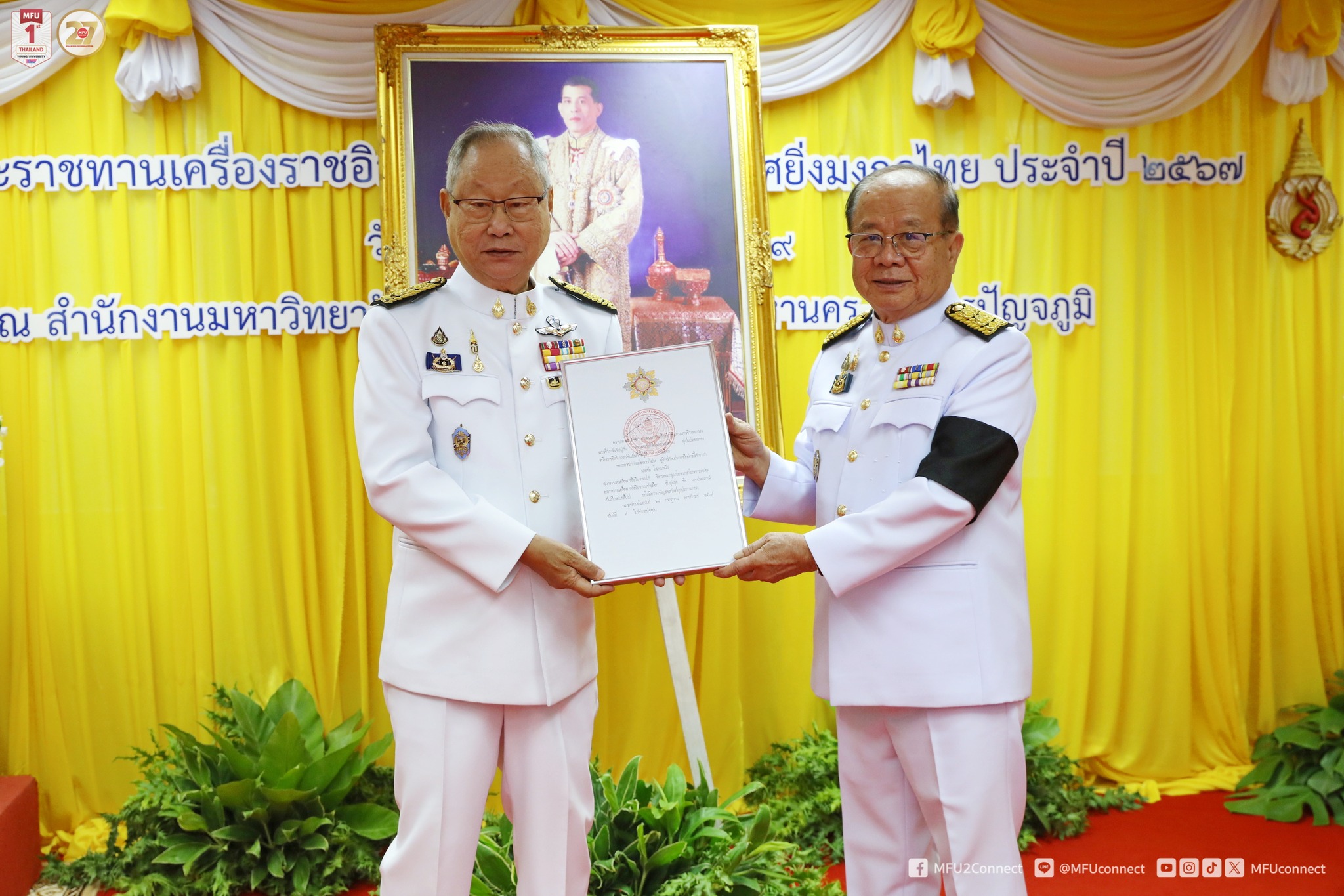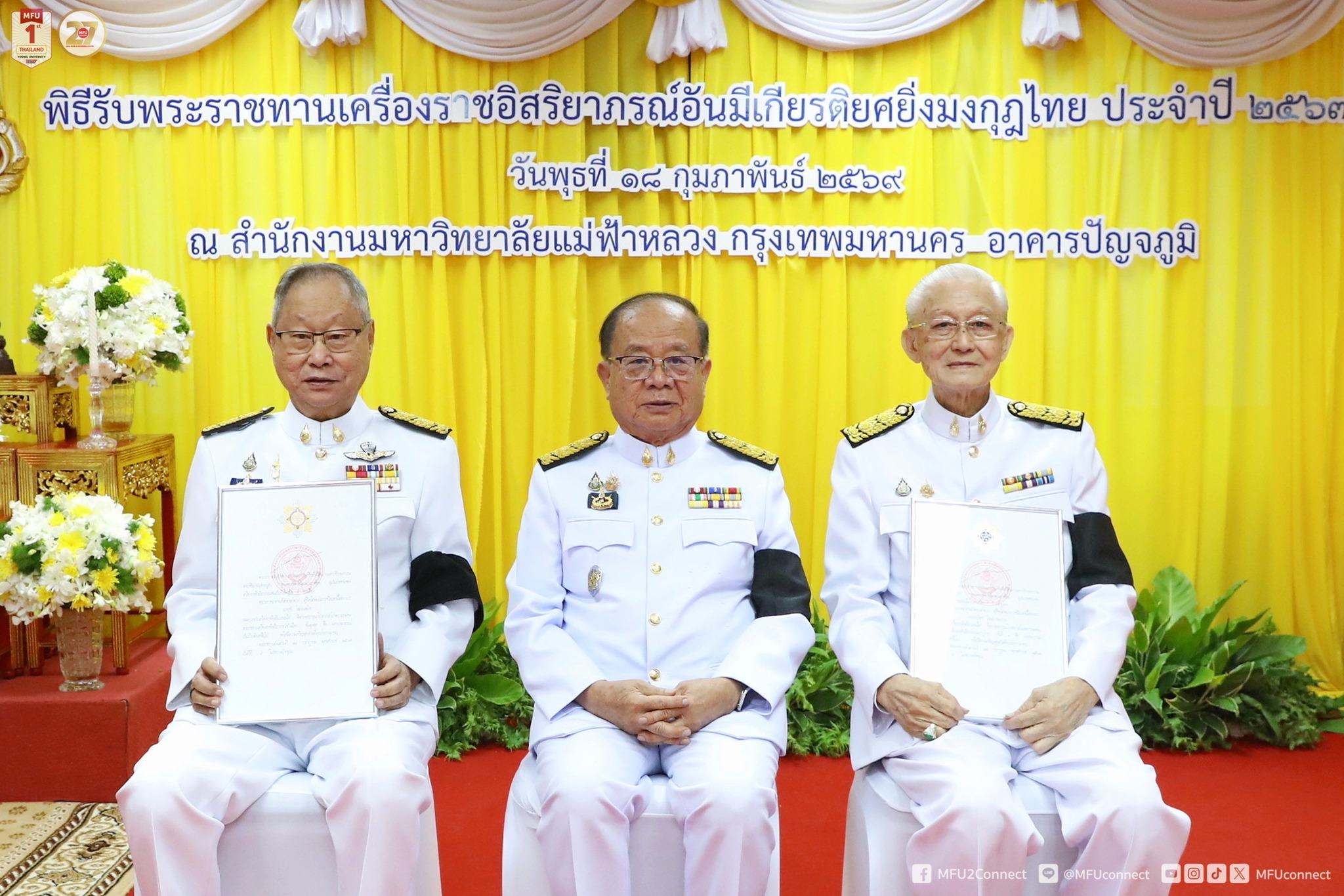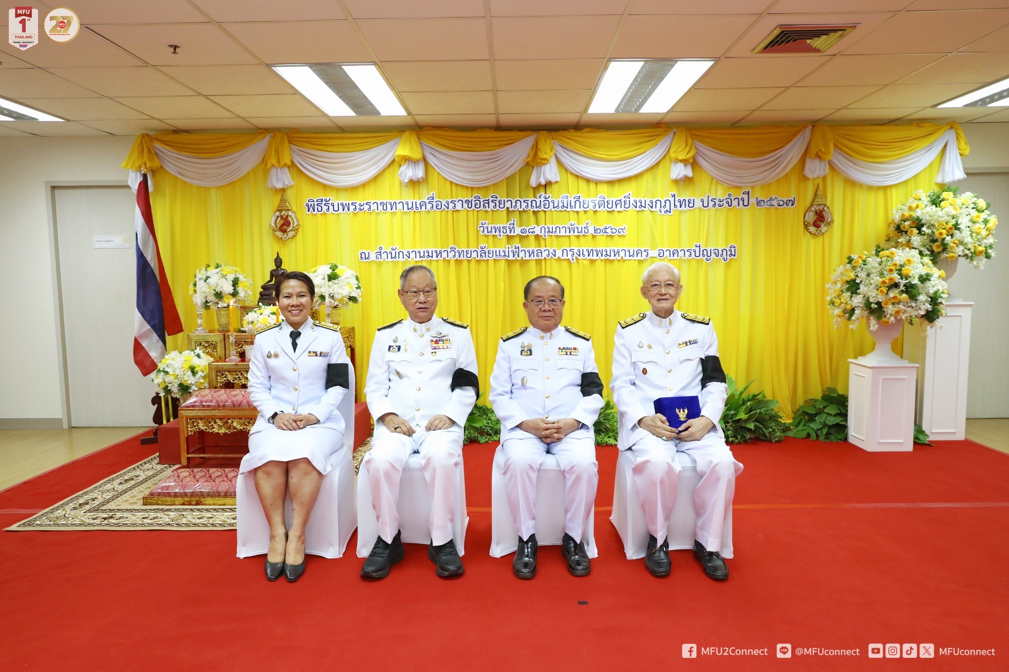 วันที่ 18 กุมภาพันธ์ 2569 มหาวิทยาลัยแม่ฟ้าหลวง (มฟล.) จัดพิธีรับพระราชทานเครื่องราชอิสริยาภรณ์อันมีเกียรติยศยิ่งมงกุฎไทย ประจำปี 2567 เบื้องหน้าพระบรมฉายาลักษณ์พระบาทสมเด็จพระเจ้าอยู่หัว ณ สำนักงานมหาวิทยาลัยแม่ฟ้าหลวง กรุงเทพมหานคร อาคารปัญจภูมิ