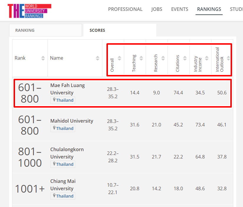ทั้งนี้สถาบันอุดมศึกษาของประเทศไทยได้รับการจัดอันดับจำนวน 16 แห่ง ซึ่ง มฟล. และมหาวิทยาลัยมหิดลอยู่ในอันดับที่ 601-800 จุฬาลงกรณ์มหาวิทยาลัยอันดับที่ 801-1,000 มหาวิทยาลัยไทยอีก 13 แห่ง อยู่ในอันดับที่ 1,000+ ได้แก่ สถาบันเทคโนโลยีพระจอมเกล้าเจ้าคุณทหารลาดกระบัง, มหาวิทยาลัยเชียงใหม่, มหาวิทยาลัยเกษตรศาสตร์, มหาวิทยาลัยขอนแก่น, มหาวิทยาลัยเทคโนโลยีพระจอมเกล้าพระนครเหนือ, มหาวิทยาลัยเทคโนโลยีพระจอมเก้าธนบุรี, มหาวิทยาลัยมหาสารคาม, มหาวิทยานเรศวร, มหาวิทยาลัยสงขลานครินทร์, มหาวิทยาลัยศิลปากร, มหาวิทยาลัยศรีนครินทรวิโรฒ, มหาวิทยาลัยเทคโนโลยีสุรนารี และมหาวิทยาลัยธรรมศาสตร์