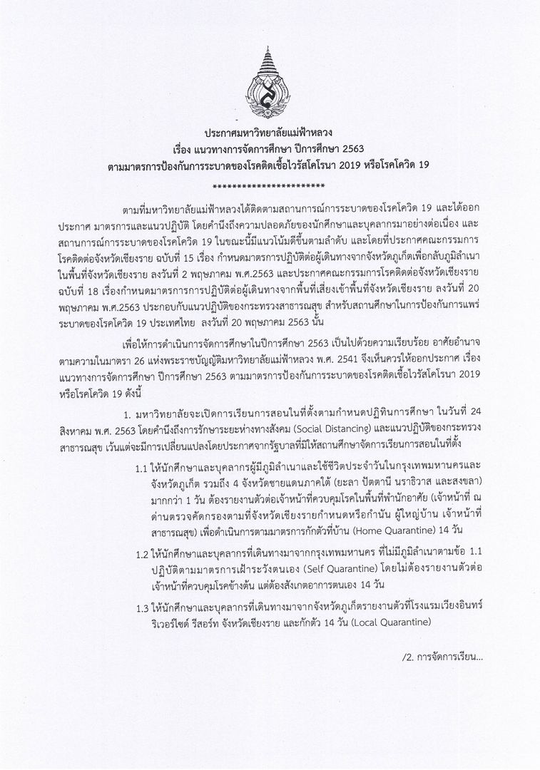 ประกาศมหาวิทยาลัยแม่ฟ้าหลวง เรื่อง แนวทางการจัดการศึกษา ปีการศึกษา 2563